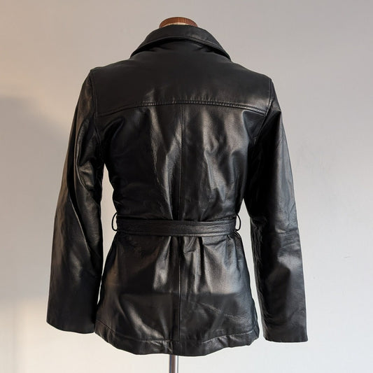 Vintage Black Genuine Leather Trench Coat Minimalist Goth Duster Jacket Small