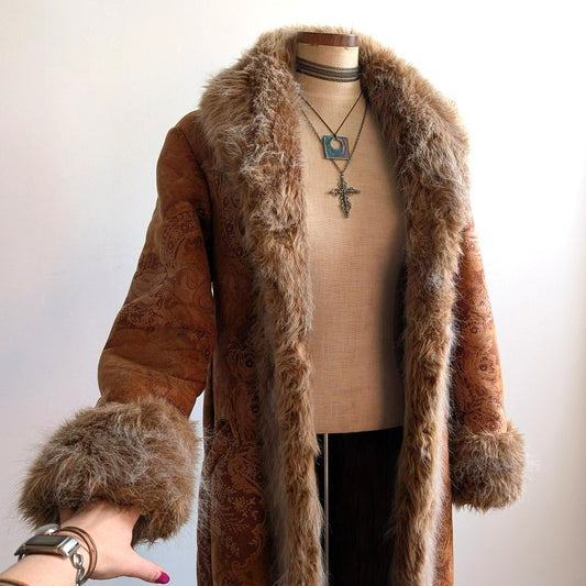 Vintage Brown Suede Penny Lane Jacket Fur Furry Leather Groovy Trench Coat Small