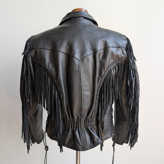 Vintage Black Leather Biker Jacket Fringe Sexy Moto Cowgirl Western Coat Small