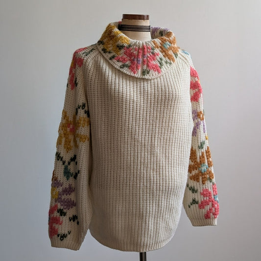 Vintage White Chunky Knit Sweater Embroidered Grannycore 70s Floral Top Large