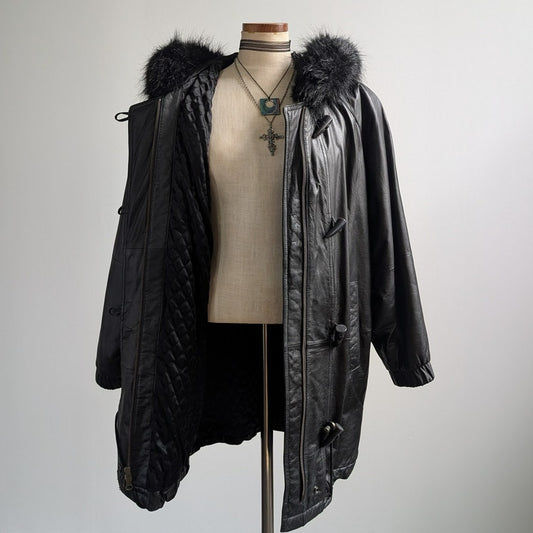 Vintage Black Leather Jacket Penny Lane Fur Hooded Trench Coat Minimalist Medium