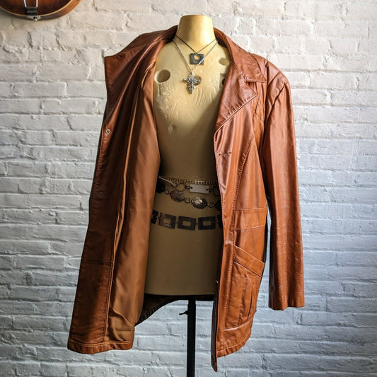 Vintage Rust Orange Leather Trench Coat Western Duster Red 70s Leather Jacket 2X