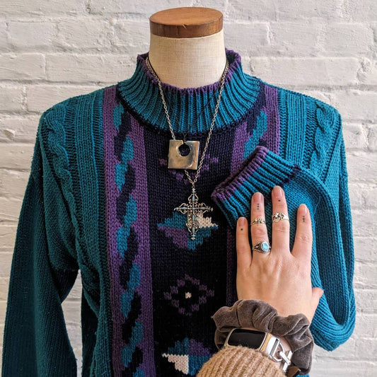 90s Vintage Chunky Knit Southwest Granny Sweater Colorblock Funky Western Top