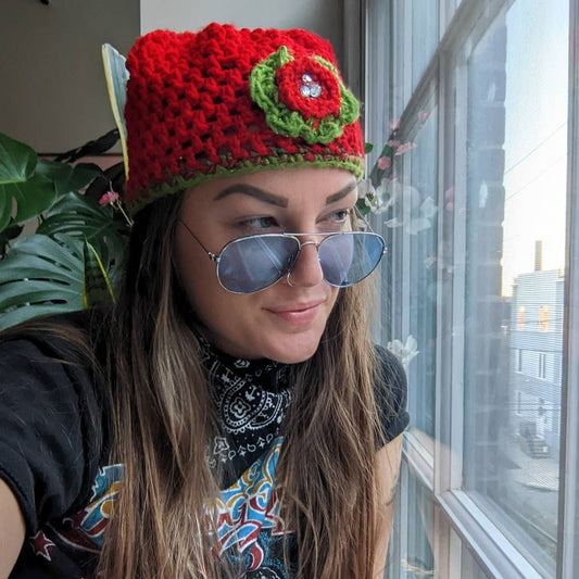 Vintage Y2K Crochet Festival Hat Kawaii Red Chunky Knit Beanie Cute Floral Funky