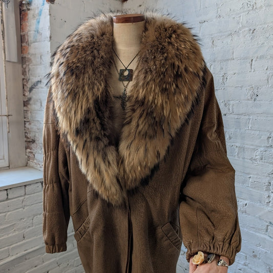 Vintage Brown Suede Fur Coat Boho Tan Leather Penny Lane Jacket Fur Trim Medium