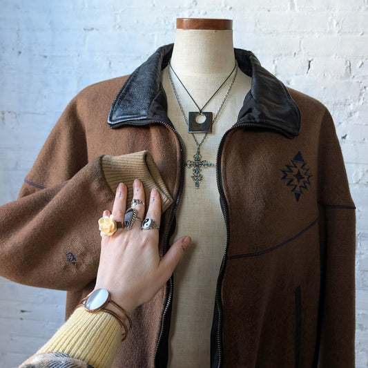 Vintage Brown Wool Leather Bomber Jacket Western Utility Cowboy Chore Coat Large
