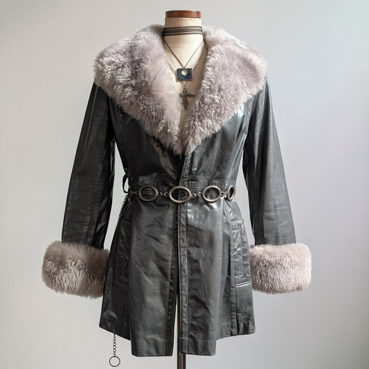 Vintage Black Leather Penny Lane Coat Faux Fur Trench Minimalist Goth Jacket