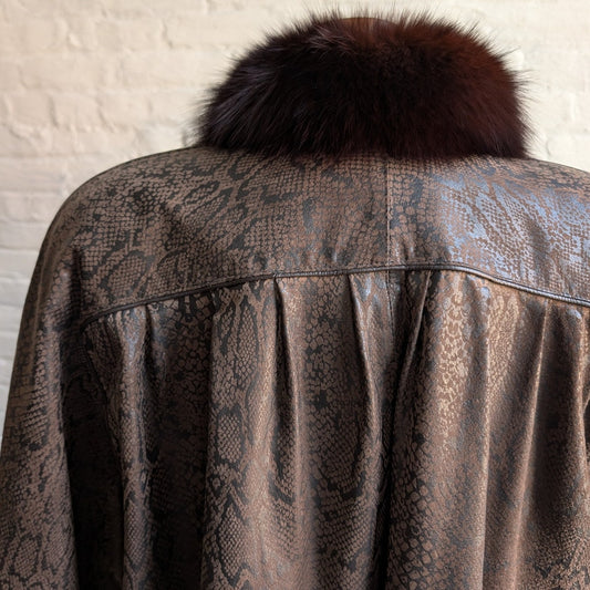 Vintage Black Leather Snakeskin Trench Coat Minimalist Penny Lane Fox Fur Jacket