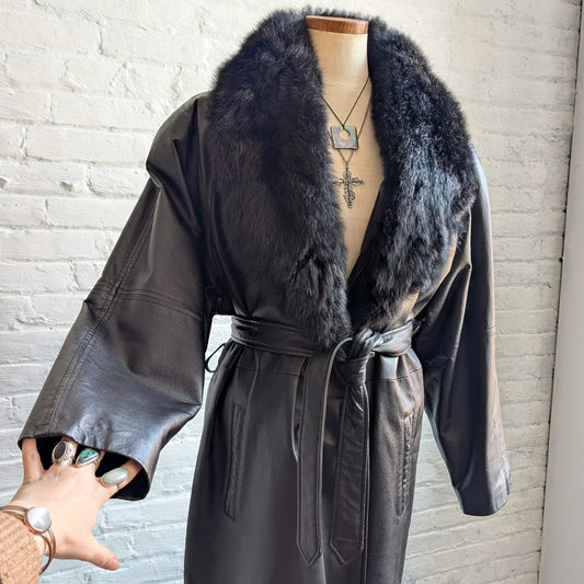 Vintage Black Leather Penny Lane Coat Fur Trench Minimalist Goth Furry Jacket
