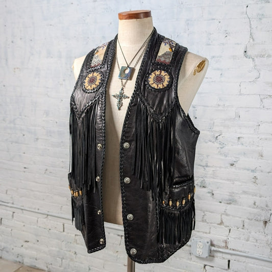 Vintage Black Leather Biker Vest Western Cowboy Fringe Vest Beaded Top Medium
