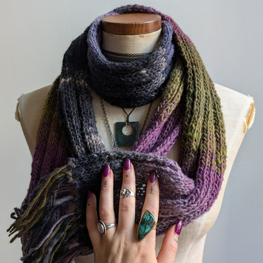 Vintage Chunky Knit Purple Green Stripe Scarf Grunge Earthy Fringe Boho Y2K Wrap