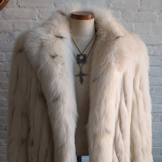 Vintage White Fluffy Fox Fur Coat Spotted Genuine Furry Mobwife Designer Jacket