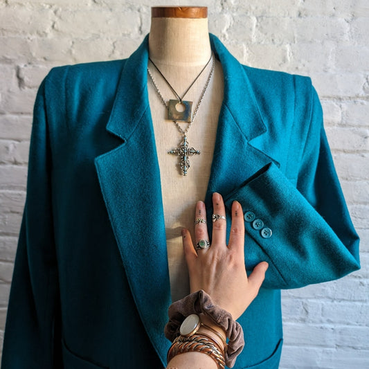 Vintage Green Blue Wool Blazer Classic Preppy Oversize Minimalist Grandpa Jacket