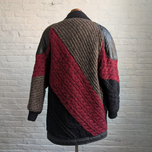 Vintage Cable Knit Leather Sweater Coat Grandpa Granny Cozy Cottage Parka Jacket