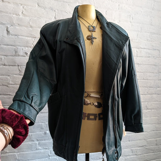 Vintage Minimalist Teal Genuine Leather Bomber Jacket Oversize Moto Biker Coat