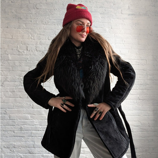 Vintage Black Faux Fur Afghan Penny Lane Jacket Shaggy Furry Boho Trench Coat