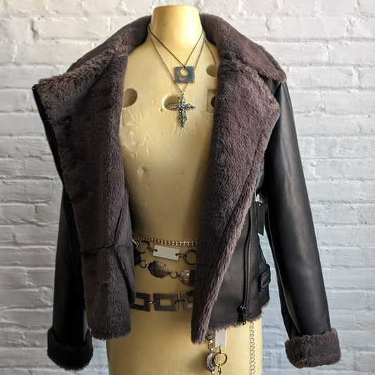 Y2K Black Faux Leather Faux Fur Moto Jacket Bomber Minimalist Grunge Biker Coat