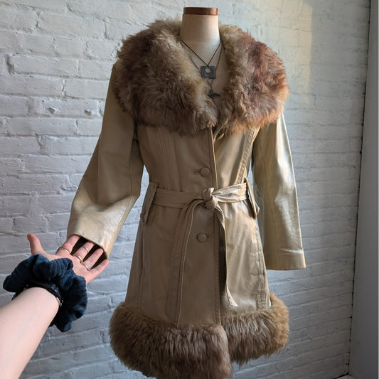 Vintage Leather Jacket Fur Trim Red 70s Penny Lane Boho Trench Afghan Coat Large