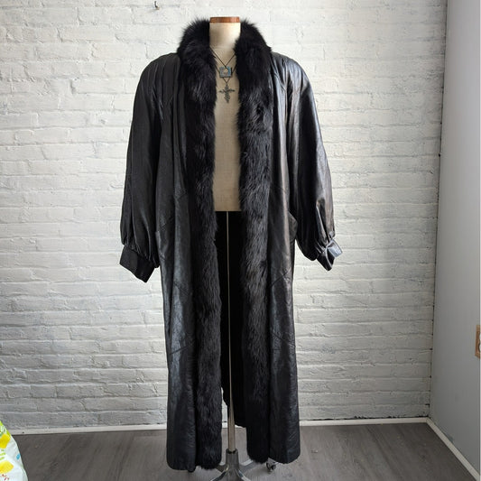 Vintage Black Leather Fox Fur Penny Lane Trench Coat Minimalist Duster Jacket