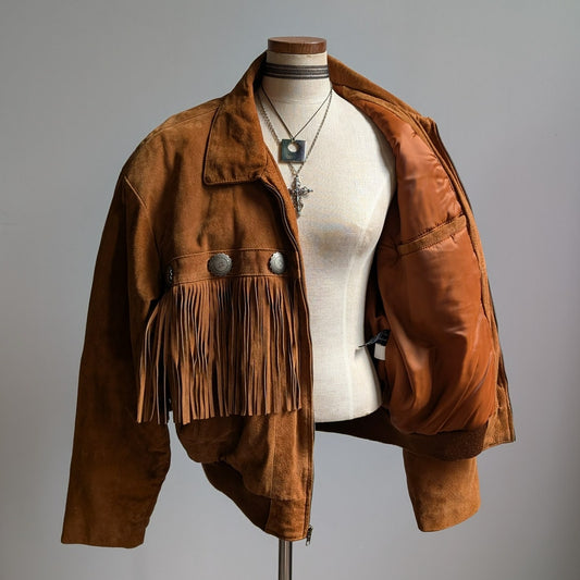 Vintage Brown Suede Leather Jacket Fringe Biker Western Moto Bomber Coat Large