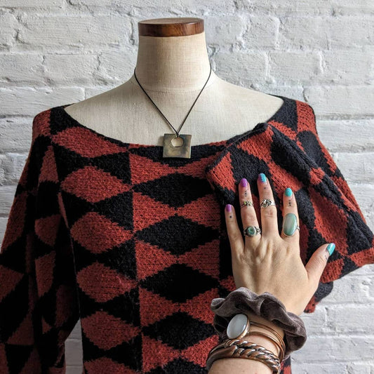 Vintage Dark Romance Fuzzy Argyle Knit Sweater Oversize Coral Back Diamond Top
