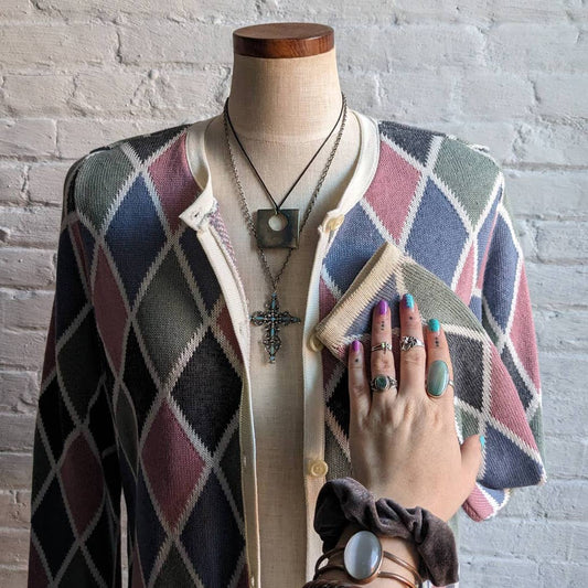 Vintage Pastel Argyle Colorblock Cardigan Diamond Granny Cottage Sweater Top