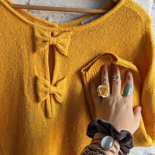 Vintage Silk Furry Chic Knit Sweater Sunny Yellow Granny Preppy Kawaii Bows Top