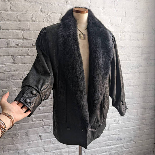 Vintage Genuine Leather Fur Black Snakeskin Lamb Biker Moto Duster Trench Coat