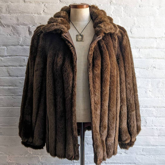 70s Vintage Jordache Brown Fur Minimalist Furry Faux Mink Bomber Jacket Coat