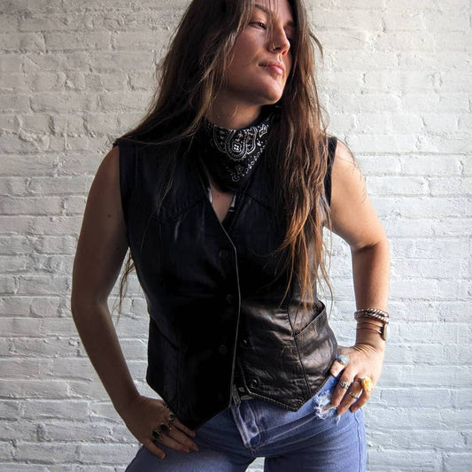 Vintage Black Genuine Leather Biker Vest Grunge Goth Moto Western Motorcycle Top