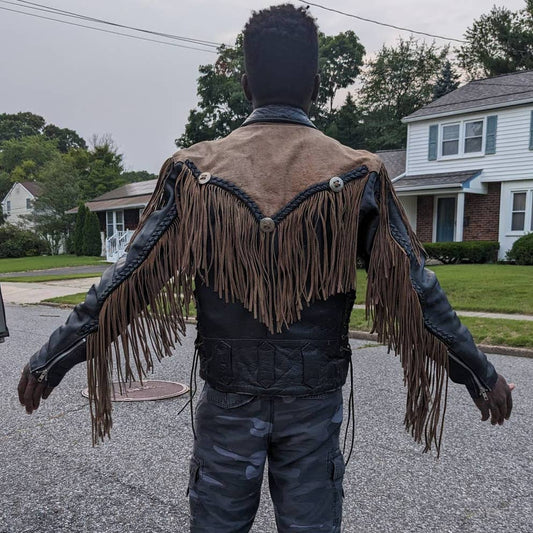 Vintage Two Tone Southwest Leather Fringe Biker Jacket Concho Motorcycle Western
