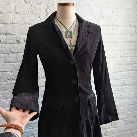 Y2K Vintage Black Velvet Corduroy Trench Coat Ruffle Flare Minimalist Shacket