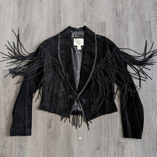 Vintage Black Leather Cropped Biker Jacket Fringe Cowgirl Western Bomber Coat