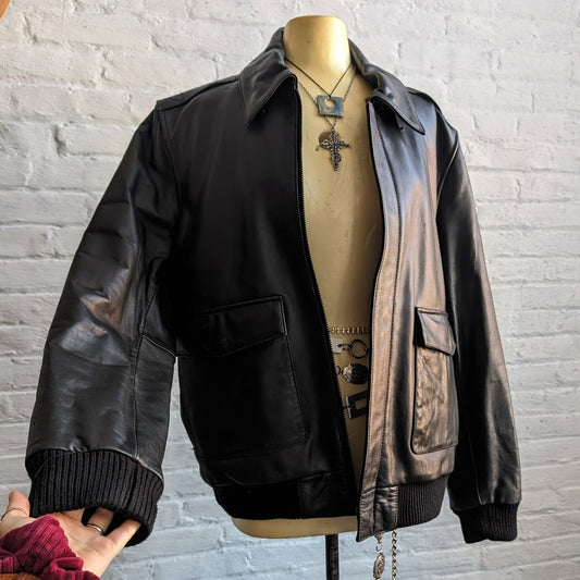 Vintage Black Leather Biker Bomber Jacket Minimalist Grunge Oversize Coat Jacket