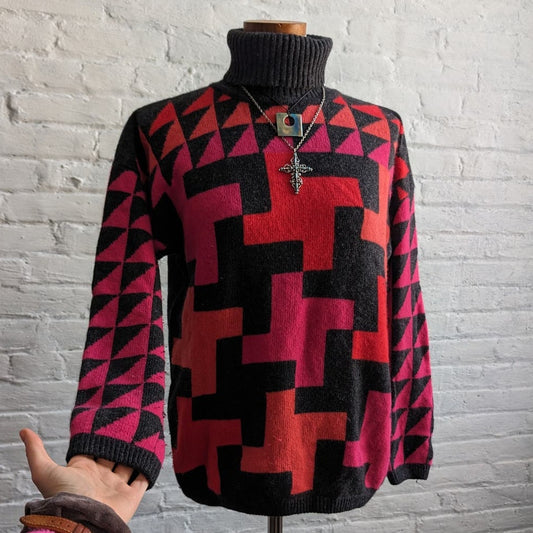 Vintage Fuzzy Wool Grandpa Sweater Colorblock Funky Geometric Furry Knit Top