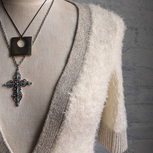 Y2K Retro Cream Preppy Fuzzy Shag Knit Cardigan Glitter Trim Cloud Sweater Top