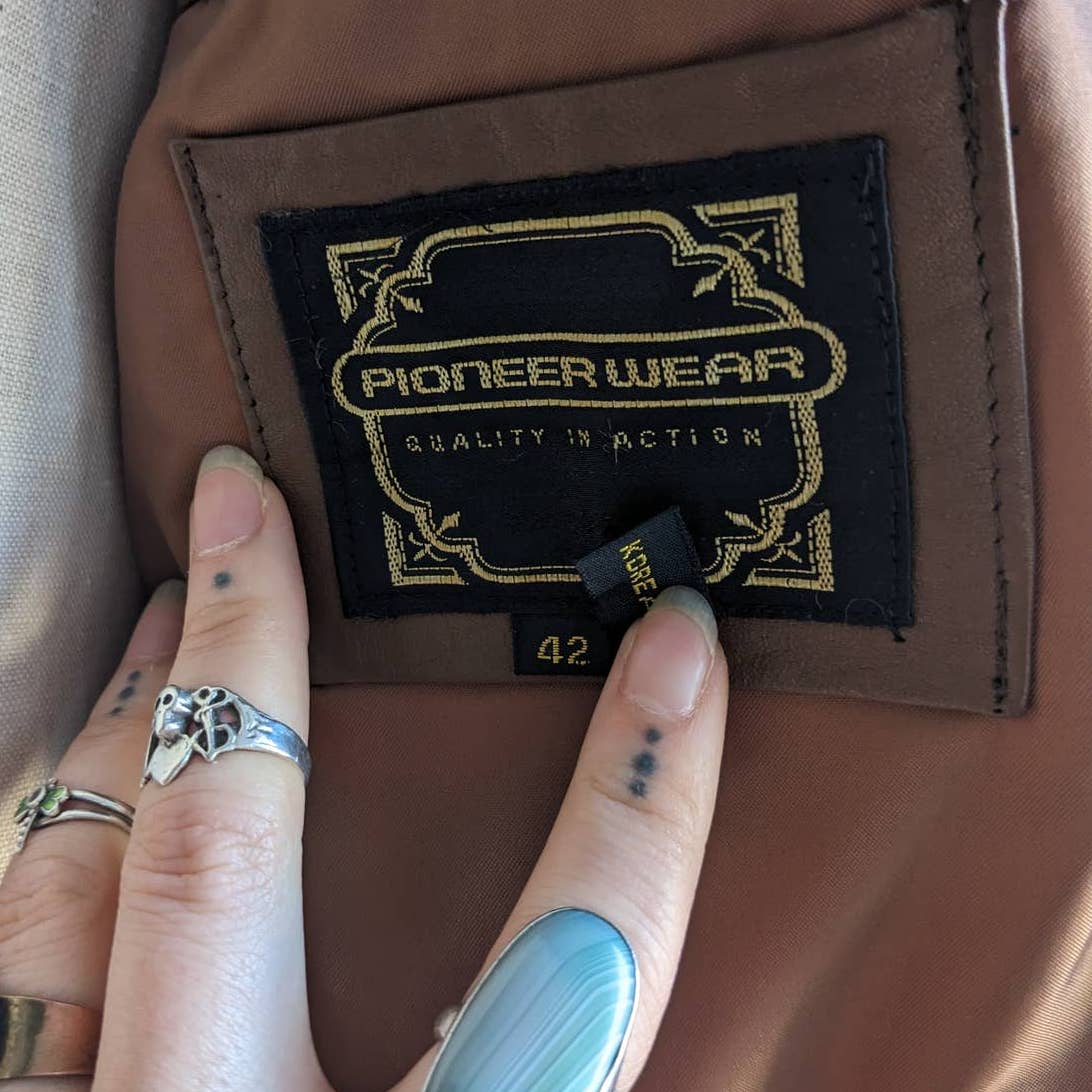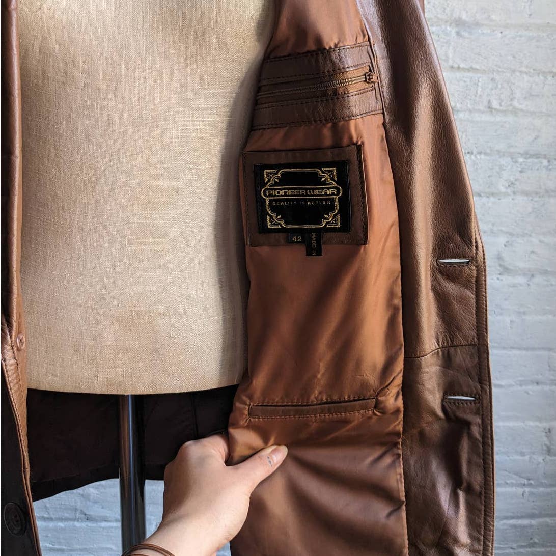 Totally loving this dope genuine leather blazer by western wear staple Pioneer Wear. Buttery soft genuine leather outer in rich rusty brown. Slight shoulder pads, longline oversized fit, back vent. Button front closure, chest pockets and cuffs. Generously sized front pockets, dual interior zipper pockets. Silky soft lining in gorgeous rusty orange is pristine, fully lined. This is a mid to heavyweight jacket.