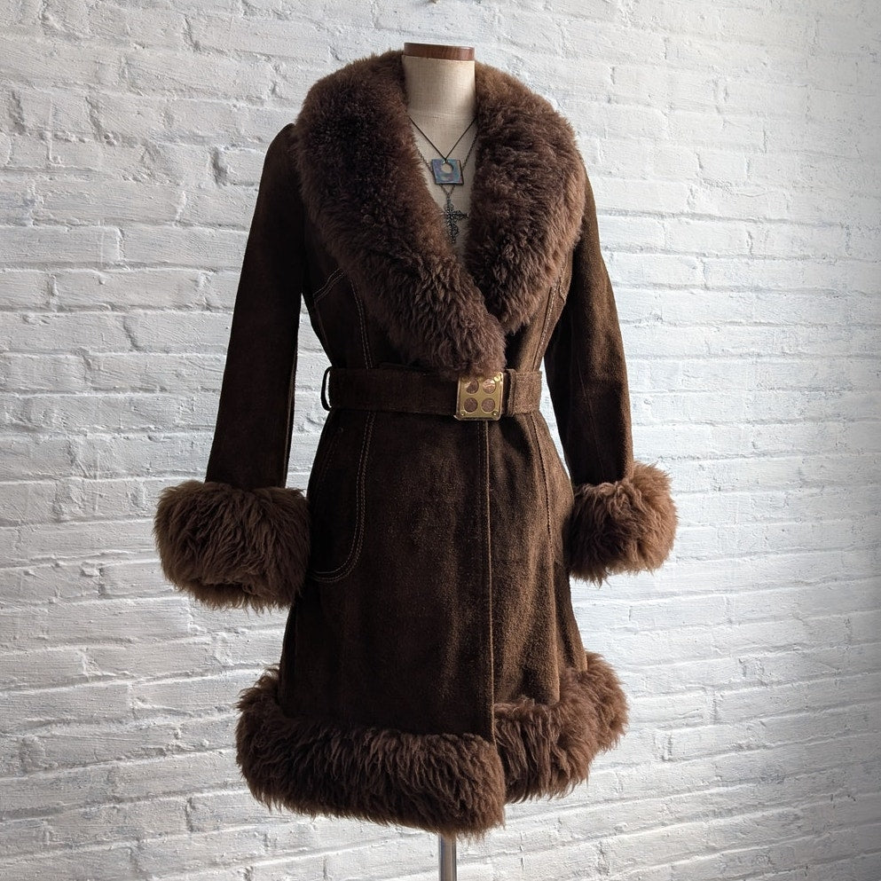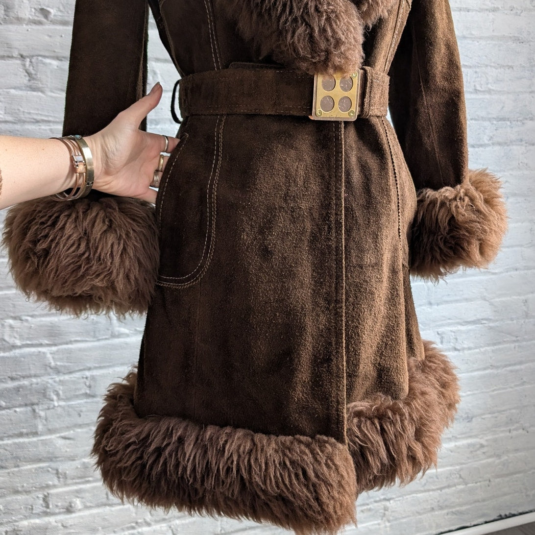 70s Brown Suede Jacket Penny Lane Fur Furry Leather Groovy Vintage Trench Coat
