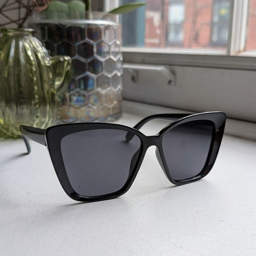 Super cute classic black cat eye sunglasses! 70s city rock and roll does Y2K devil wears prada vibes. Black on black, goes with everything! Lightweight sturdy plastic frames and lenses. Chic and fashionable, perfect for a bright sunny day. Minimal clean look, comfortable plastic no snag nosepiece. New without tags.