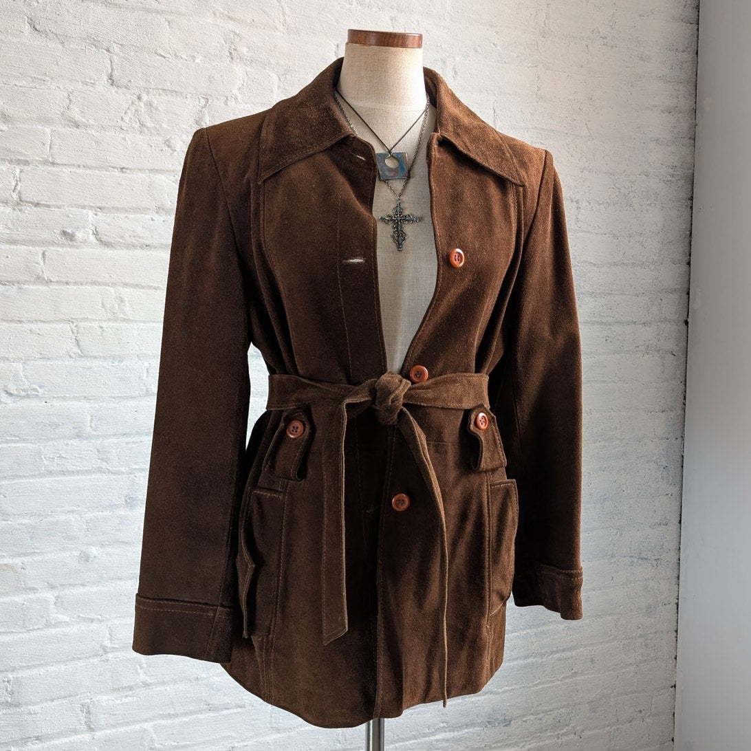 70s Vintage Brown Suede Leather Jacket Minimalist Boho Moto Biker Trench Coat