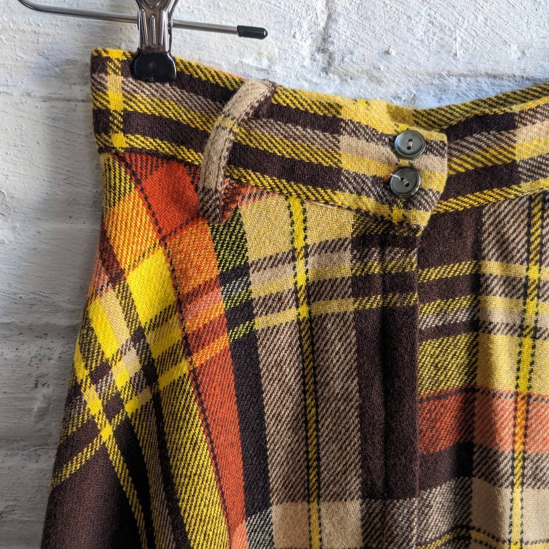 Love! Absolutely perfect color pop flared groovy plaid skirt in vibrant cozy earth tones. Rusty orange, bright yellow and warm chocolate brown stripes with all over tartan design. Giving groovy 70s sunshine babe does 90s varsity grunge girl vibes. Swirly grey pearlized button waist can be worn high or low depending on desired fit and measurements. Hidden talon zipper closure. Flowy silhouette drapes perfectly. Unlined. Cozy warm thick material perfect for pairing tights, doc martens and your fav thrashed cropped band tee. Gently used, in excellent vintage condition.