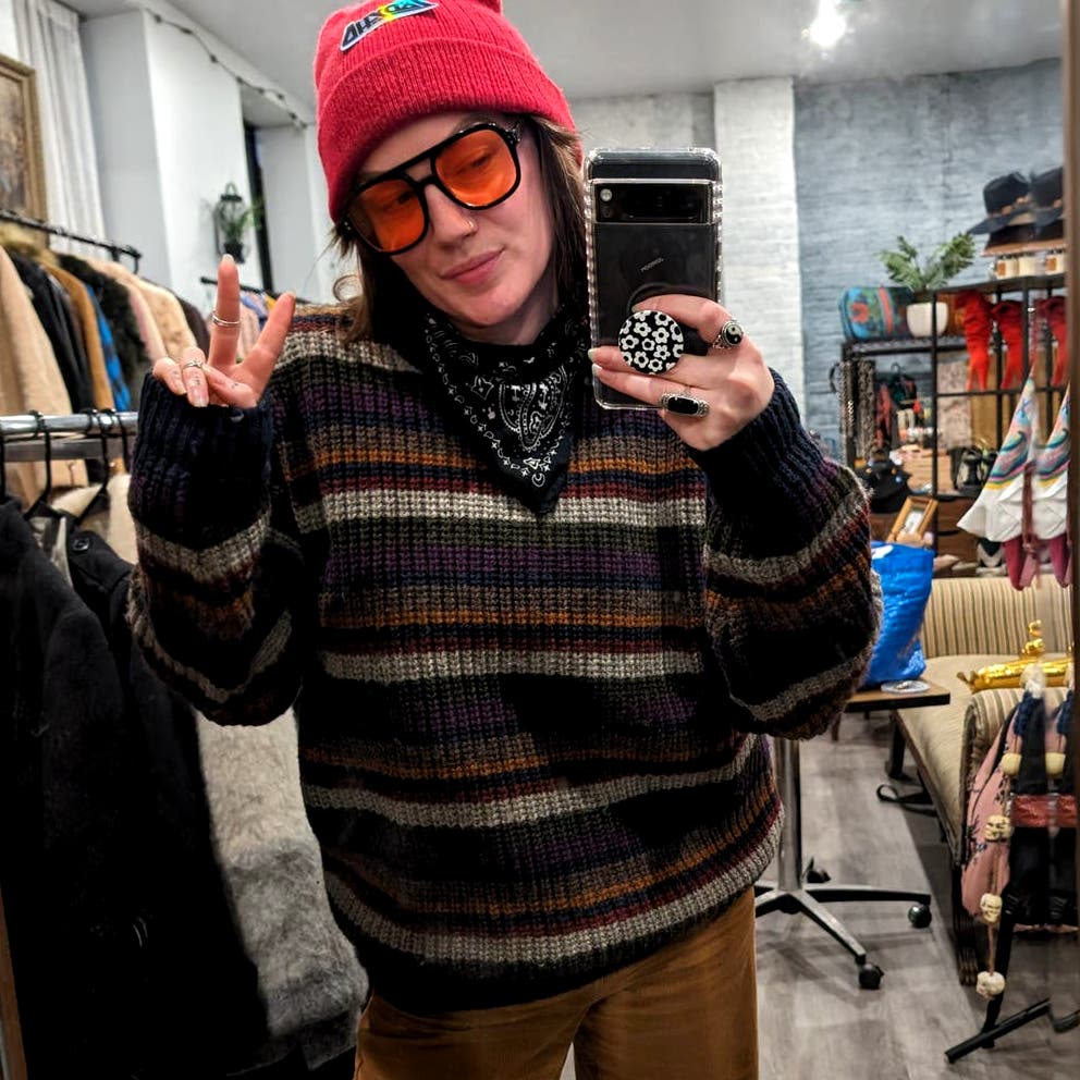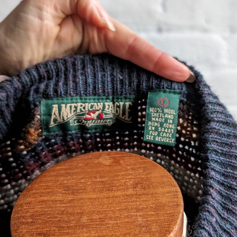 Rare find! Peep those late 70s early 80s American Eagle tags on this rad vintage chunky knit grandpa sweater! Cozy 100% shetland wool with muted multicolor rainbow stripes in earthy purple, mustard yellow, moss green tones. Dark academia nerdcore does earthtone grannycore vibes. Chunky ribbed knit, crewneck. Oversize slouchy fit with good stretch. Mid-weight cozy warm. Gently used, in excellent vintage condition.