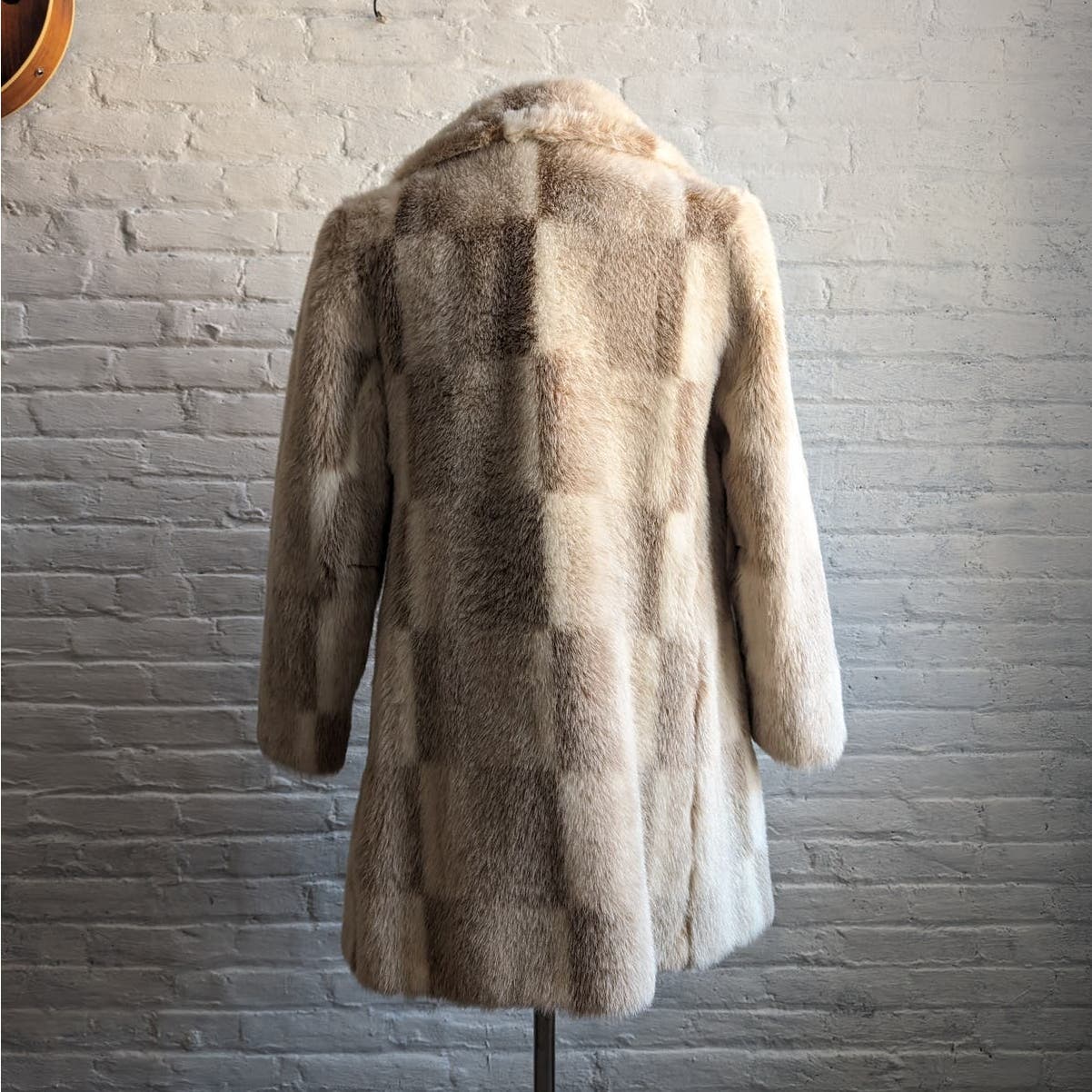 Striking! Obsessed with this gorgeous well cared for ombre checkered faux rabbit fur. 70s almost famous does boho rock star girlfriend vibes. Unique colorblock shag is luxurious and so soft! Earthy neutral caramel brown, tan and cream tones. Sexy oversize split dagger collar, double breasted accent button front. Silky soft lining, pockets! No balding or matting. Cozy mid-weight jacket. Hits lower thigh on 5'4 model. Missing bottom button! Gently used, in excellent vintage condition.