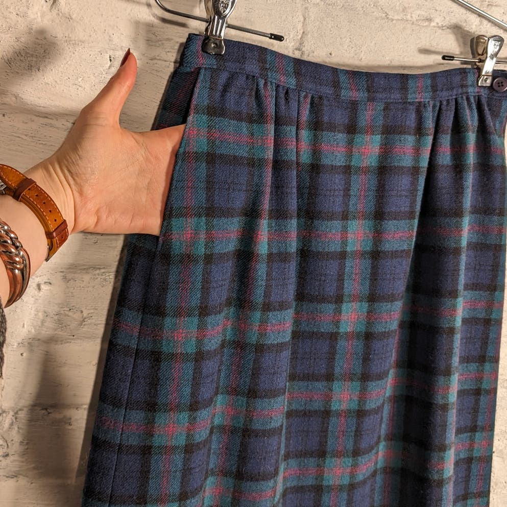 Amazing vintage Pendleton 100% wool skirt in deep navy and muted mossy green with muted hot pink on black stripe plaid. Woodsy dark academia does 90s minimalist grunge fairy vibes. Midi length with understated school girl pleated details. She's got pockets too! Side button closure, fully lined. Cozy warm high quality 100% wool perfect for pairing with fleece lined tights, docs, your fav thrashed cropped band tees and your best penny lane fur! Hits just below the knee on 5'4 model. Gently used, in excellent vintage condition.
