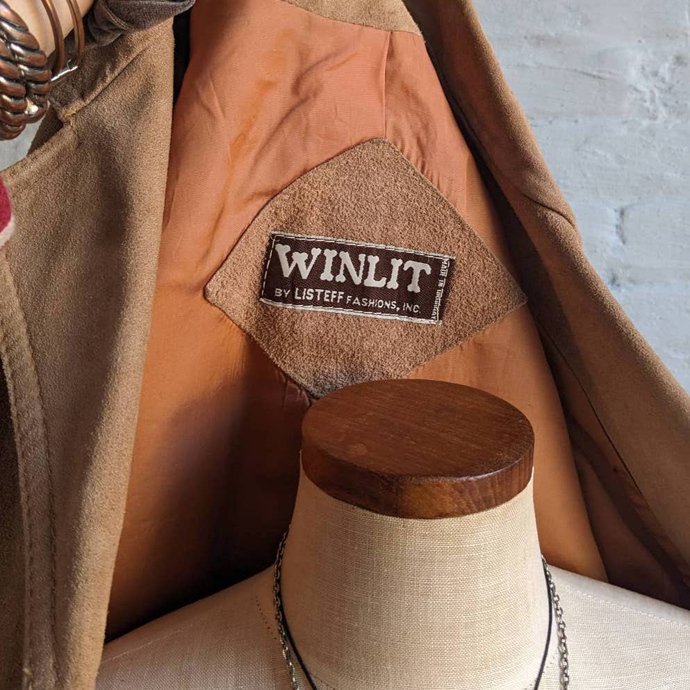 Looove this one! This beauty will last a lifetime and beyond. Major 70s groovy cowgirl does almost famous vibes. Gorgeous velvety soft suede in earthy neutral camel tan. Elongated split collar, structured shoulders, fitted waist with cinching tie belt. Gorgeous tortishell button front closure, front pockets, fully lined. Heavy weight high quality flexible suede. Perfection. In excellent vintage condition.