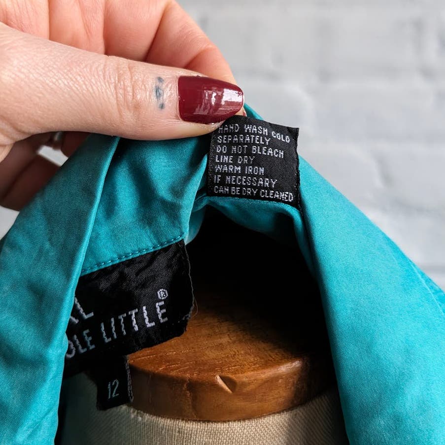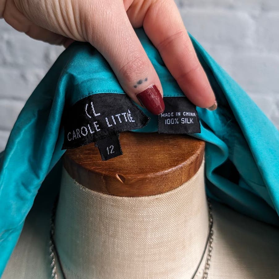 Statement piece from my personal closet! Loving this gorgeous 100% silk mini trench with that color pop hue! Silky soft lightweight in vibrant aquamarine teal jewel tone. Total 90s romance soft girl does mermaid coastal grandma vibes. Perfect cover up to slip over lingerie or belted as a sexy shirt dress. Silk covered button front closure, pockets.
