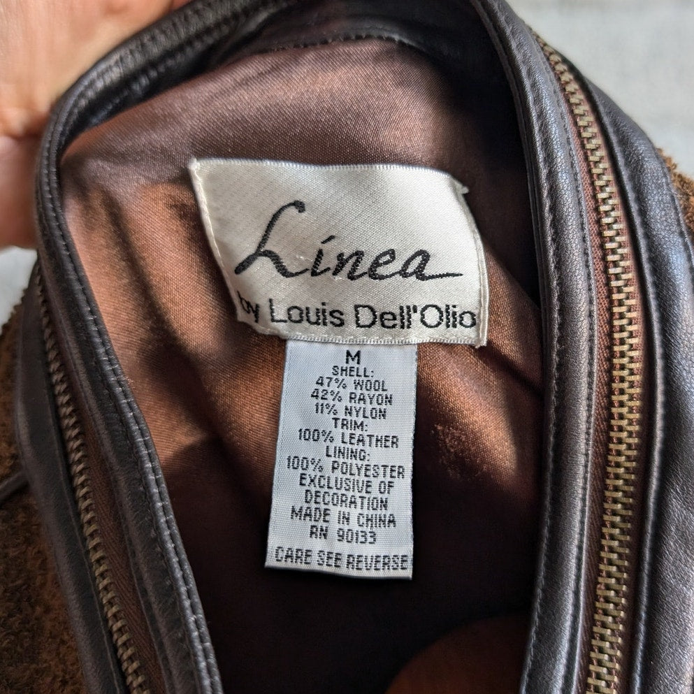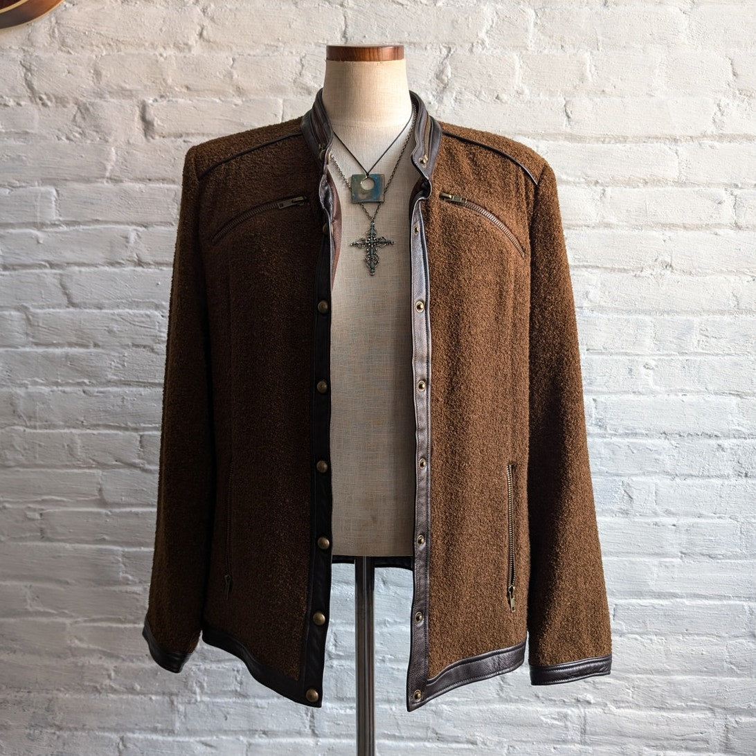 90s Vintage Brown Wool Leather Jacket Boucle Knit Steampunk Utility Coat Blazer