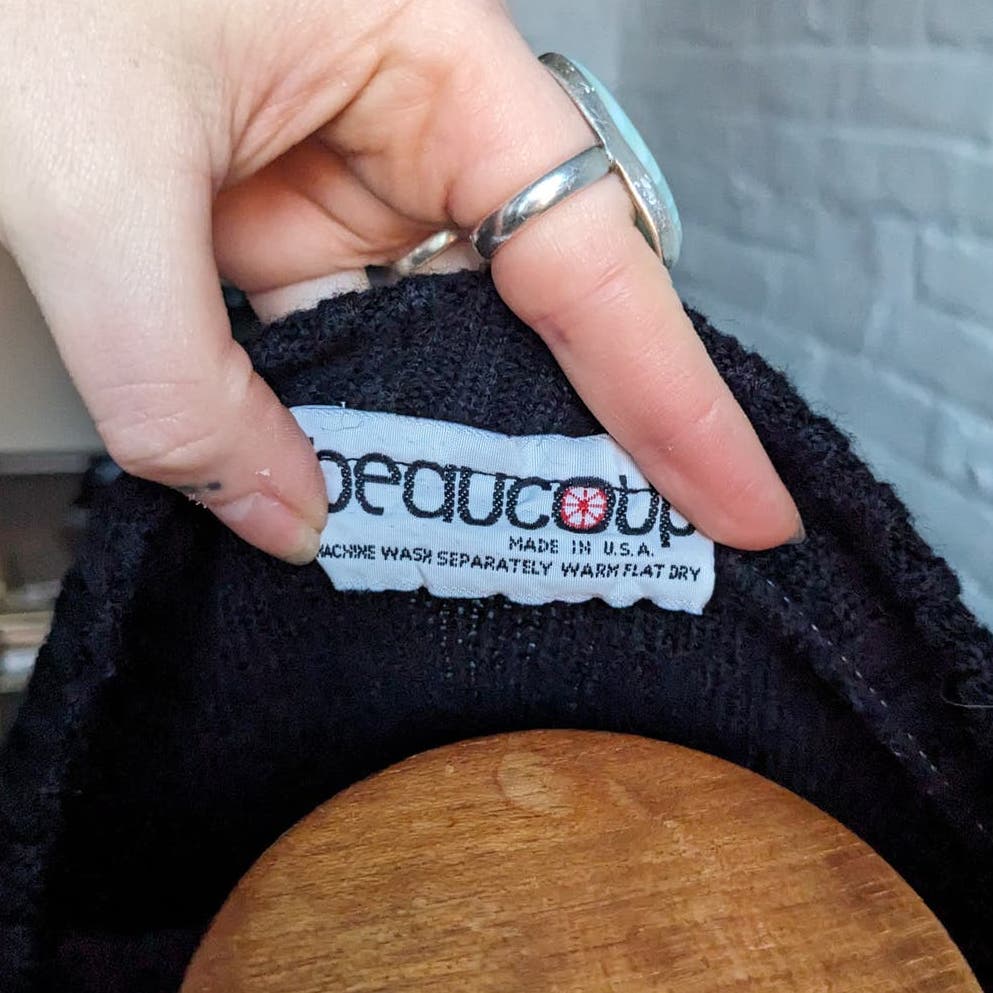 Dope little cozy knit sweater with trippy swirly floral design throughout. Vibrant magenta hot pink, ultramarine blue and sage green color pop on black. 90s cottagecore granny does 80s cat lady maximalism. Soft and cozy, longline silhouette with oversize fit. Ribbed details, mini crew mock neck. Double dare you to wear this baby inside out for an even wilder look! Minor pilling. Gently used, in excellent vintage condition.