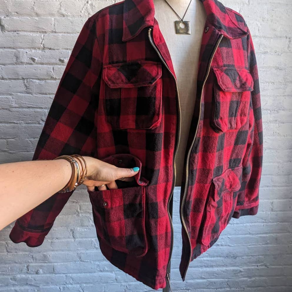 Rad longline oversized thermal flannel shacket in classic muted red buffalo plaid. Super cozy warm and soft 100% cotton outer. Sherpa fleece lining, fully lined. Heavy duty zipper front closure, snap closure pockets at chest and mid waist as well as open side pockets. Longline silhouette. This is a cozy heavy weight jacket perfect as a stand alone layer. Sherpa lining has some compression from use. Gently used, in excellent vintage condition.