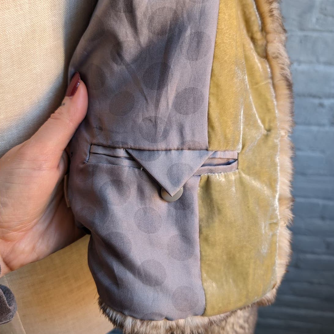 Love!! Super cute fuzzed out cropped vegan fur jacket from Anthropologie. 70s Daisy Jones rock n roll girlfriend does chic mob wife boss babe. Feathery soft wispy shaggy faux fox fur in warm sandy tan with ombre brown grey highlights. Plush baby soft feel. Cropped silhouette with hidden clasp closures for a sexy desert chic look. Adorable polkadot lining with velvet trim. Mid weight, perfect for layers. Gently used, in excellent condition.